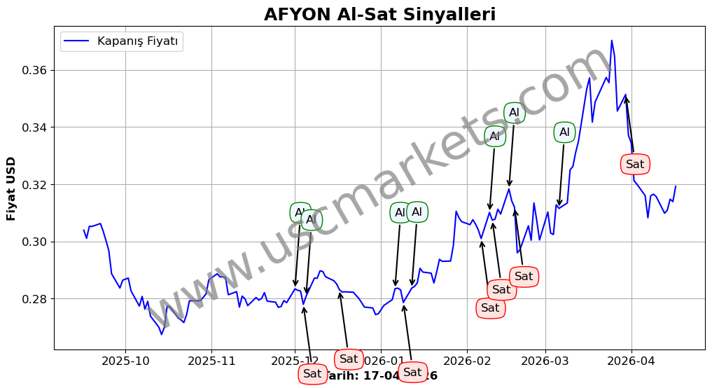 AFYON hisse fiyatı son bir ayda dolar cinsinden %-6.73 değer kaybederek , 18-03-2026 tarihinde 0.342 Dolardan 0.319 Dolara düştü.