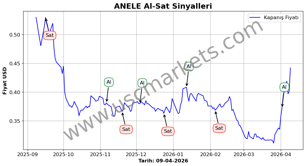 Son durum : 09-04-2026 tarihinde ANELE hissesi için 'Alış' sinyali verildi. Bu, hissenin değer kazanma olasılığını gösterir.