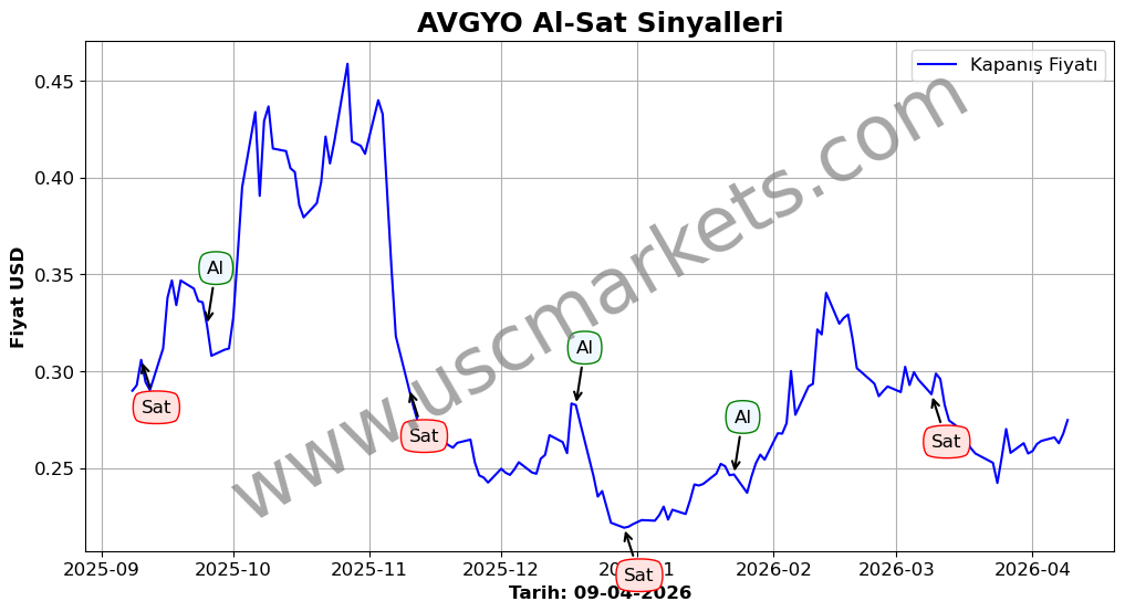 Son durum : 08-04-2026 tarihinde AVGYO hissesi için 'Alış' sinyali verildi. Bu, hissenin değer kazanma olasılığını gösterir.