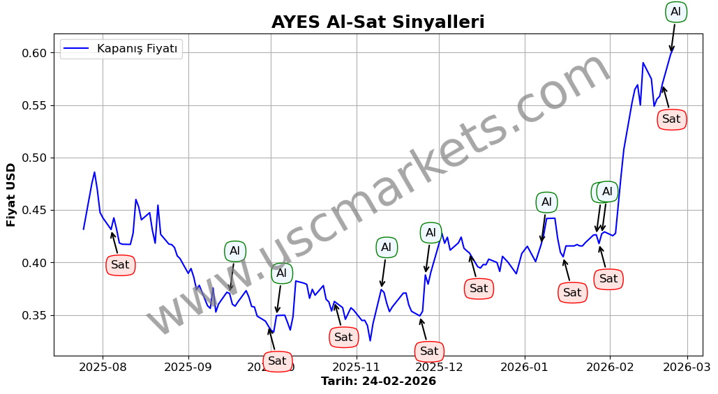 AYES hisse fiyatı geçen yıl 20-02-2025 tarihinde 0.26 USD iken, bir yıl içinde dolar cinsinden %119.23 değer kazanarak, 0.57 USD'e yükseldi.
