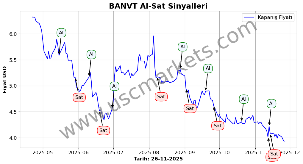 Son durum : 29-08-2025 tarihinde BANVT hissesi için 'Satış' sinyali verildi. Bu, hissenin değer kaybetme olasılığını gösterir.