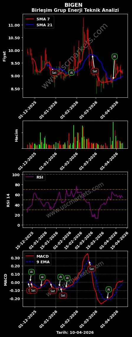 - USC Markets, BIGEN hisse senedi için MACD göstergesi (9, 12, 26 parametreleri kullanılarak) son olarak bir 'Al' sinyali üretti. USC Markets Birleşim Grup Enerji hisse senedi önerisini 'Al' olarak belirledi.