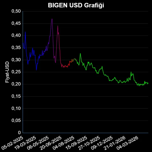 BIGEN hisse fiyatı son bir ayda dolar cinsinden %1.49 değer kazanarak , 10-03-2026 tarihinde 0.201 Dolardan 0.204 Dolara yükseldi.
