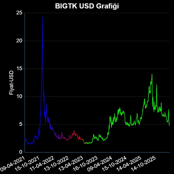 BIGTK hisse fiyatı geçen yıl 10-04-2025 tarihinde 6.293 USD iken, bir yıl içinde dolar cinsinden %-22.74 değer kaybederek, 4.862 USD'e düştü.