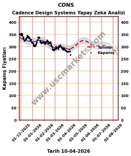 Yapay zeka yardımıyla hazırladığımız fiyat tahmin grafiği, CDNS hisse yorumu ve Cadence Design Systems 2026 yıl sonu hedef fiyat tahminleri yukarıda detaylı olarak yer almaktadır.