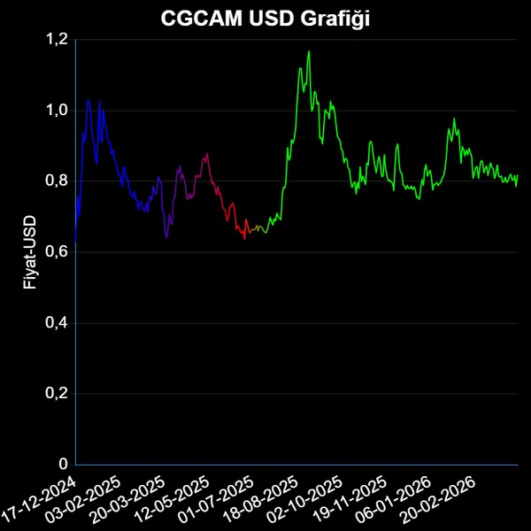 CGCAM hisse fiyatı geçen yıl 10-04-2025 tarihinde 0.807 USD iken, bir yıl içinde dolar cinsinden %0.37 değer kazanarak, 0.81 USD'e yükseldi.