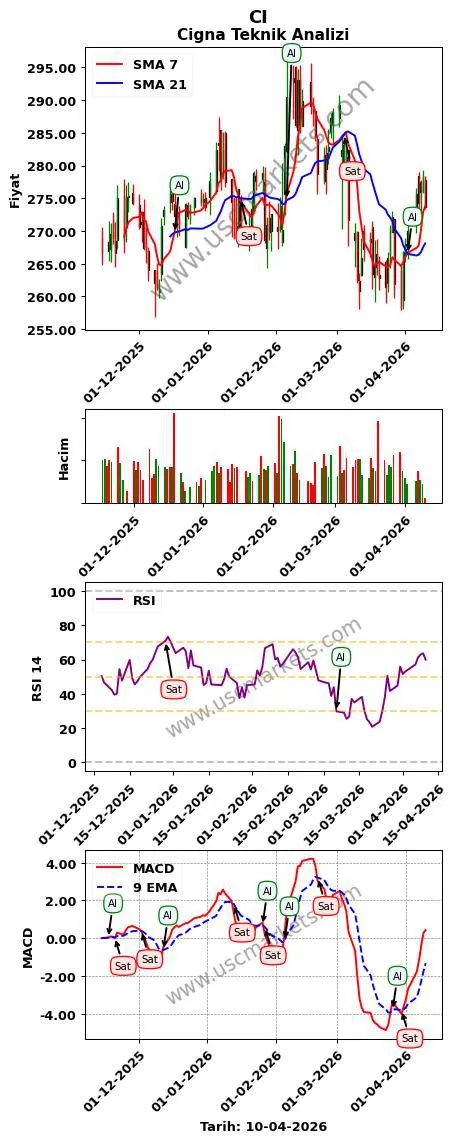CI grafiği incelendiğinde, Cigna teknik analizinde teknik göstergeler ile alım-satım sinyalleri üretilmiştir.Piyasada 100'den fazla teknik gösterge vardır. Her teknik gösterge farklı sinyaller üretebilir.