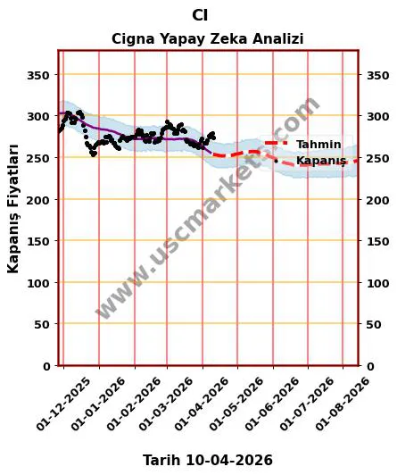 Yapay zeka yardımıyla hazırladığımız fiyat tahmin grafiği, CI hisse yorumu ve Cigna 2026 yıl sonu hedef fiyat tahminleri yukarıda detaylı olarak yer almaktadır.