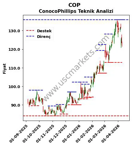 COP yorumu ile ilgili algoritmik analiz sonuçlarına göre belirlenen ConocoPhillips destek ve direnç fiyatları aşağıdaki tablodadır.