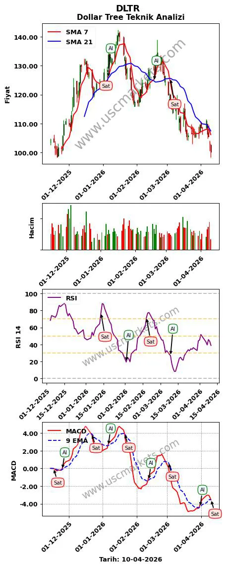 DLTR grafiği incelendiğinde, Dollar Tree teknik analizinde teknik göstergeler ile alım-satım sinyalleri üretilmiştir.Piyasada 100'den fazla teknik gösterge vardır. Her teknik gösterge farklı sinyaller üretebilir.