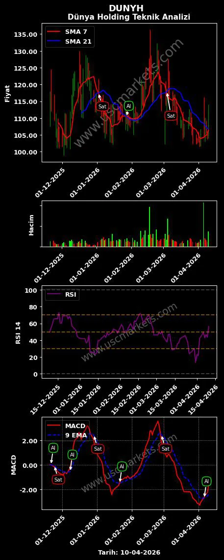 - DUNYH teknik analizi 14 günlük periyotlu RSI göstergesi en son bir 'Al' sinyali üretmiştir.