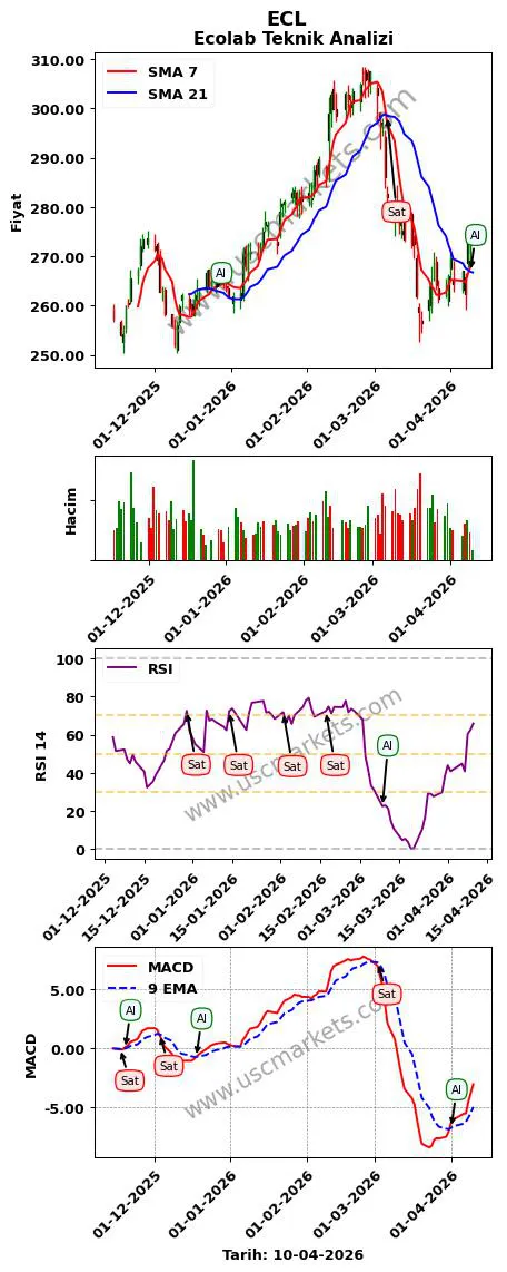 ECL grafiği incelendiğinde, Ecolab teknik analizinde teknik göstergeler ile alım-satım sinyalleri üretilmiştir.Piyasada 100'den fazla teknik gösterge vardır. Her teknik gösterge farklı sinyaller üretebilir.