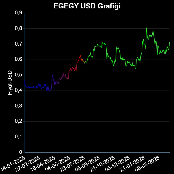 EGEGY hisse fiyatı geçen yıl 10-04-2025 tarihinde 0.5 USD iken, bir yıl içinde dolar cinsinden %39.40 değer kazanarak, 0.697 USD'e yükseldi.