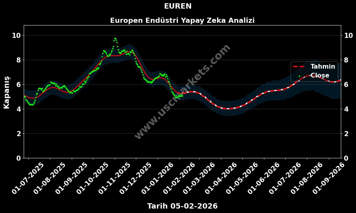 Yapay zeka yardımıyla hazırladığımız fiyat tahmin grafiğini, EUREN hisse yorumunu ve Europen Endüstri yıl sonu hedef fiyat tahminlerini yukarıda inceledik.