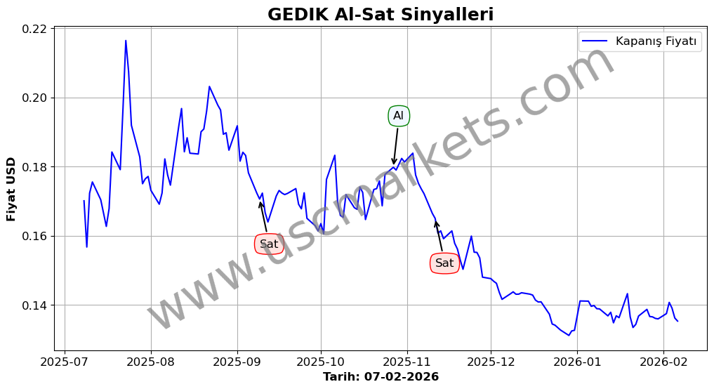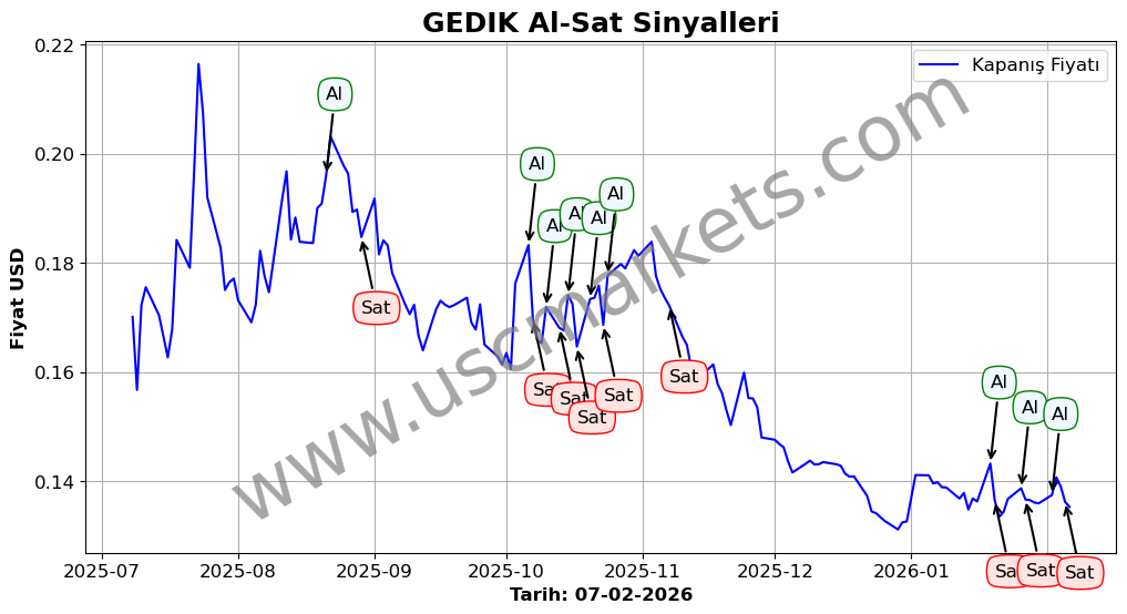 Son durum : 05-02-2026 tarihinde GEDIK hissesi için 'Satış' sinyali verildi. Bu, hissenin değer kaybetme olasılığını gösterir.