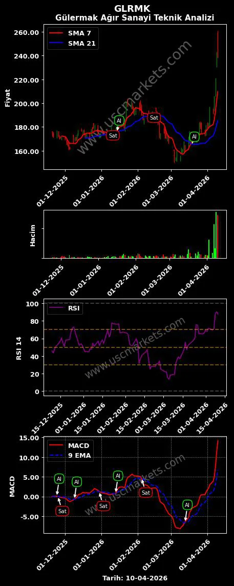 - USC Markets, GLRMK hisse senedi için MACD göstergesi (9, 12, 26 parametreleri kullanılarak) son olarak bir 'Al' sinyali üretti. USC Markets Gülermak Ağır Sanayi hisse senedi önerisini 'Al' olarak belirledi.