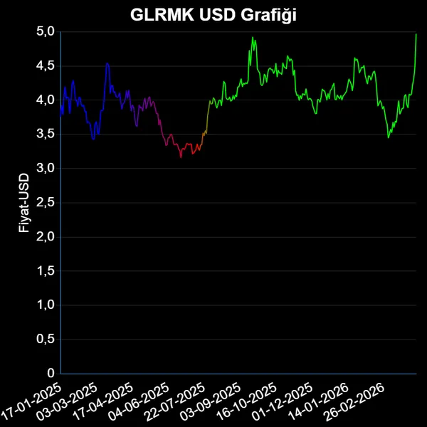 GLRMK hisse fiyatı son bir ayda dolar cinsinden %48.41 değer kazanarak , 10-03-2026 tarihinde 3.675 Dolardan 5.454 Dolara yükseldi.