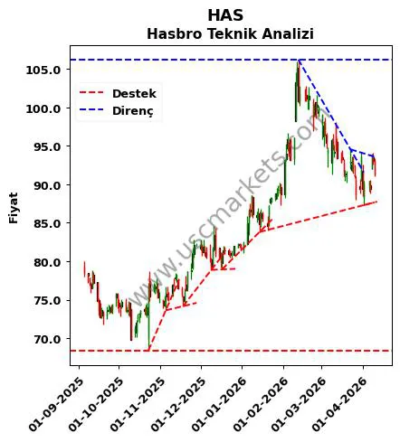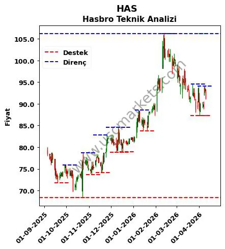 HAS yorumu ile ilgili algoritmik analiz sonuçlarına göre belirlenen Hasbro destek ve direnç fiyatları aşağıdaki tablodadır.