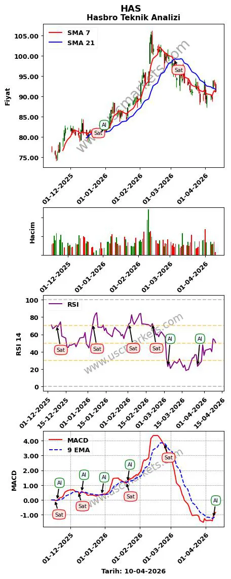 HAS grafiği incelendiğinde, Hasbro teknik analizinde teknik göstergeler ile alım-satım sinyalleri üretilmiştir.Piyasada 100'den fazla teknik gösterge vardır. Her teknik gösterge farklı sinyaller üretebilir.