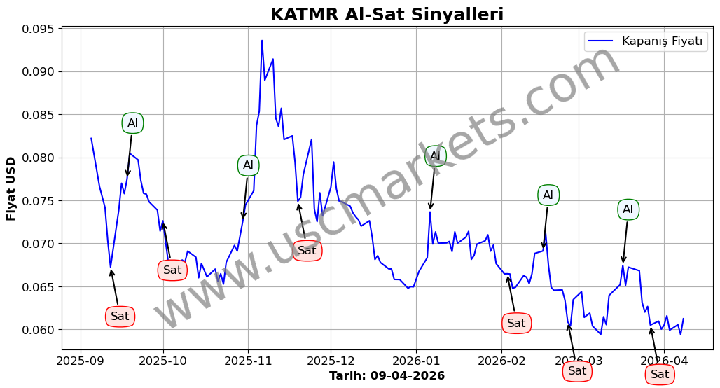 Son durum : 08-04-2026 tarihinde KATMR hissesi için 'Alış' sinyali verildi. Bu, hissenin değer kazanma olasılığını gösterir.
