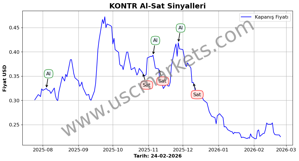 Son durum : 18-02-2026 tarihinde KONTR hissesi için 'Satış' sinyali verildi. Bu, hissenin değer kaybetme olasılığını gösterir.