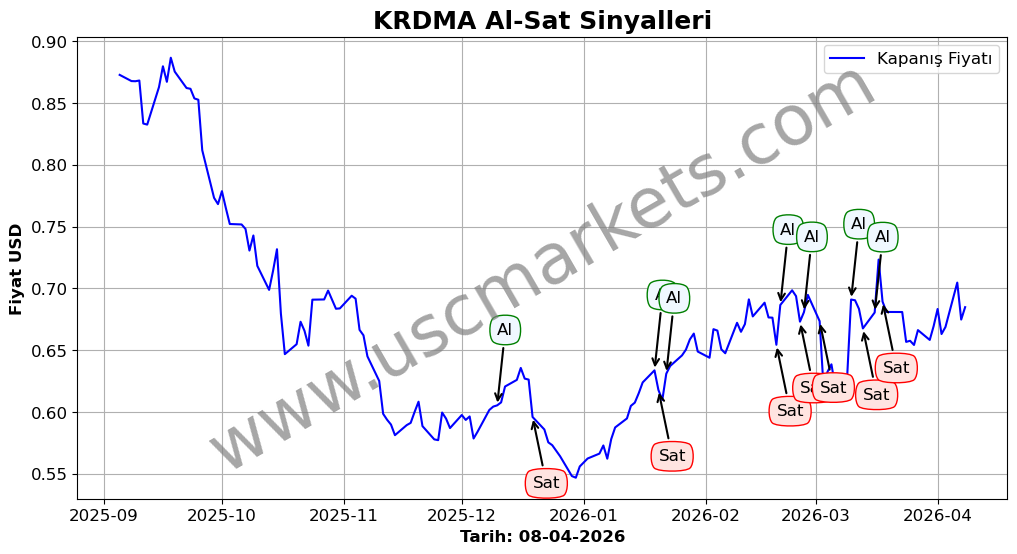 Son durum : 12-03-2026 tarihinde KRDMA hissesi için 'Alış' sinyali verildi. Bu, hissenin değer kazanma olasılığını gösterir.