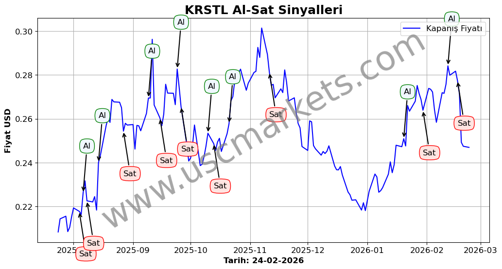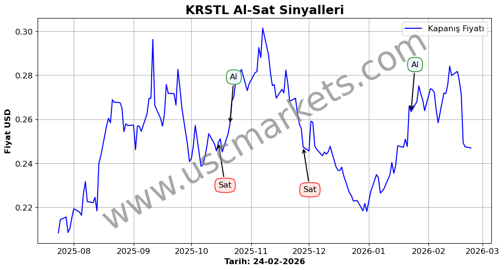 Son durum : 18-02-2026 tarihinde KRSTL hissesi için 'Satış' sinyali verildi. Bu, hissenin değer kaybetme olasılığını gösterir.