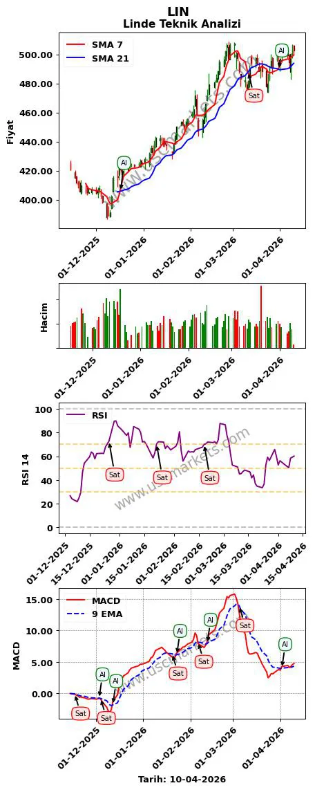 LIN grafiği incelendiğinde, Linde teknik analizinde teknik göstergeler ile alım-satım sinyalleri üretilmiştir.Piyasada 100'den fazla teknik gösterge vardır. Her teknik gösterge farklı sinyaller üretebilir.