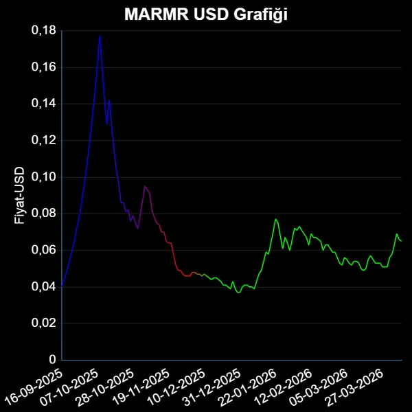 MARMR hisse fiyatı son bir ayda dolar cinsinden %18.52 değer kazanarak , 10-03-2026 tarihinde 0.054 Dolardan 0.064 Dolara yükseldi.