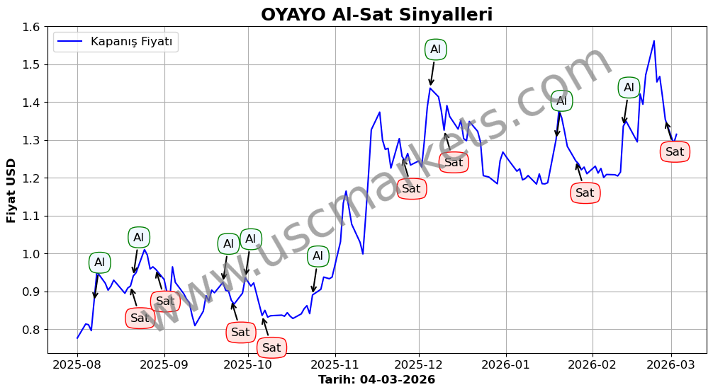 Son durum : 24-02-2026 tarihinde OYAYO hissesi için 'Satış' sinyali verildi. Bu, hissenin değer kaybetme olasılığını gösterir.