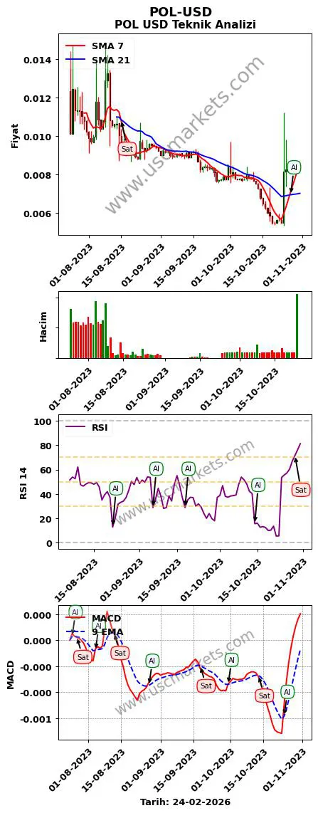 - POL-USD teknik analizi MACD göstergesi (9, 12, 26 parametreleri ile) en son bir 'Al' sinyali üretmiştir.