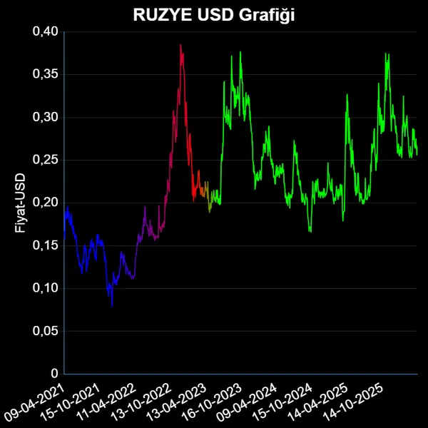 RUZYE hisse fiyatı geçen yıl 10-04-2025 tarihinde 0.269 USD iken, bir yıl içinde dolar cinsinden %-1.86 değer kaybederek, 0.264 USD'e düştü.