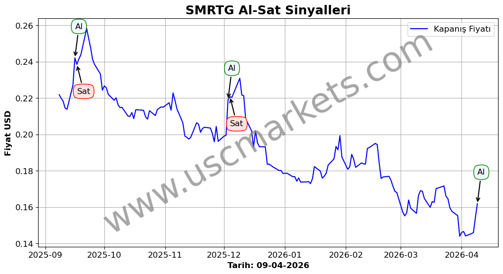 Son durum : 08-04-2026 tarihinde SMRTG hissesi için 'Alış' sinyali verildi. Bu, hissenin değer kazanma olasılığını gösterir.