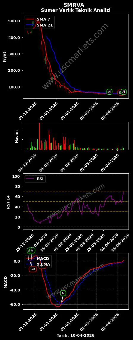 - SMRVA hisse senedinde en son 7 günlük hareketli ortalamanın 21 günlük hareketli ortalamayı yukarı doğru kesmiştir. USC Markets Sumer Varlık hisse senedi önerisini 'Al' olarak belirledi.