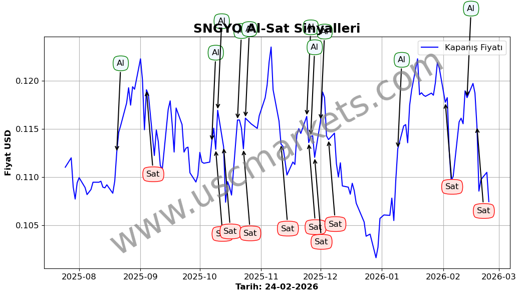 Son durum : 19-02-2026 tarihinde SNGYO hissesi için 'Satış' sinyali verildi. Bu, hissenin değer kaybetme olasılığını gösterir.