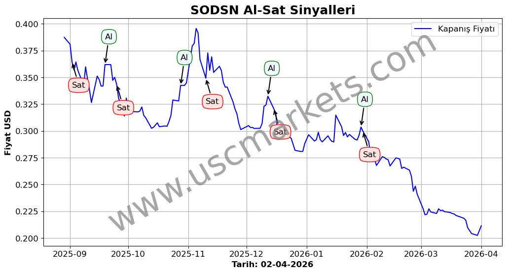 Son durum : 02-02-2026 tarihinde SODSN hissesi için 'Satış' sinyali verildi. Bu, hissenin değer kaybetme olasılığını gösterir.