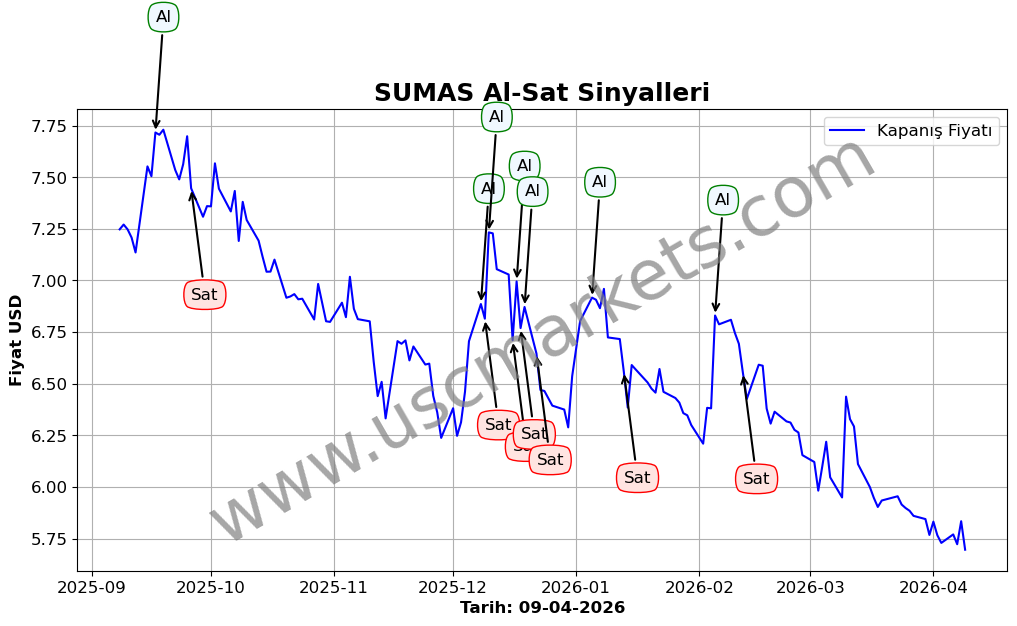 Son durum : 04-03-2026 tarihinde SUMAS hissesi için 'Satış' sinyali verildi. Bu, hissenin değer kaybetme olasılığını gösterir.