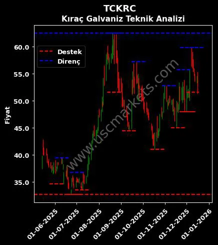 USC Markets TCKRC hisse yorumu ile ilgili teknik analiz sonuçlarına göre hesaplanan Kıraç Galvaniz destek ve direnç fiyatları aşağıdaki tablodadır.