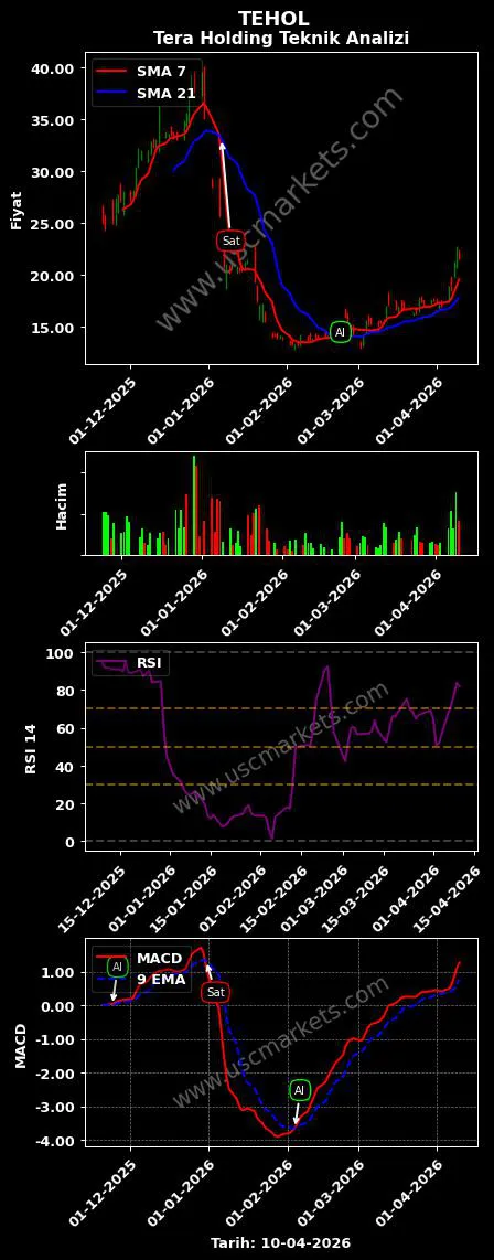 - TEHOL hisse senedinde en son 7 günlük hareketli ortalamanın 21 günlük hareketli ortalamayı yukarı doğru kesmiştir. USC Markets Tera Holding hisse senedi önerisini 'Al' olarak belirledi.