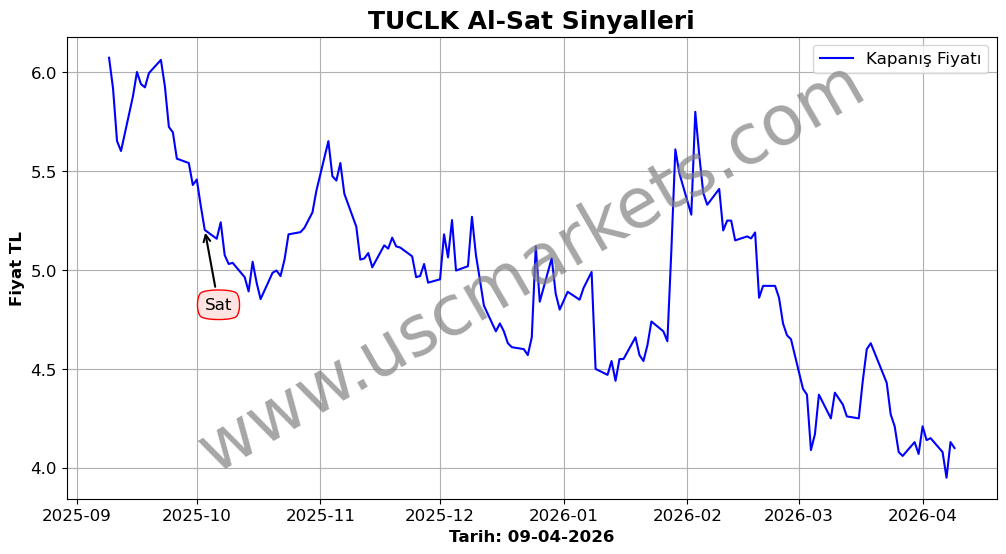 Son durum : 23-03-2026 tarihinde TUCLK hissesi için 'Satış' sinyali verildi. Bu, hissenin değer kaybetme olasılığını gösterir.