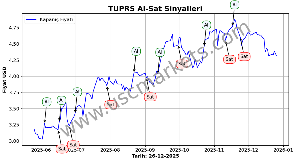Son durum : 17-12-2025 tarihinde TUPRS hissesi için 'Satış' sinyali verildi. Bu, hissenin değer kaybetme olasılığını gösterir.