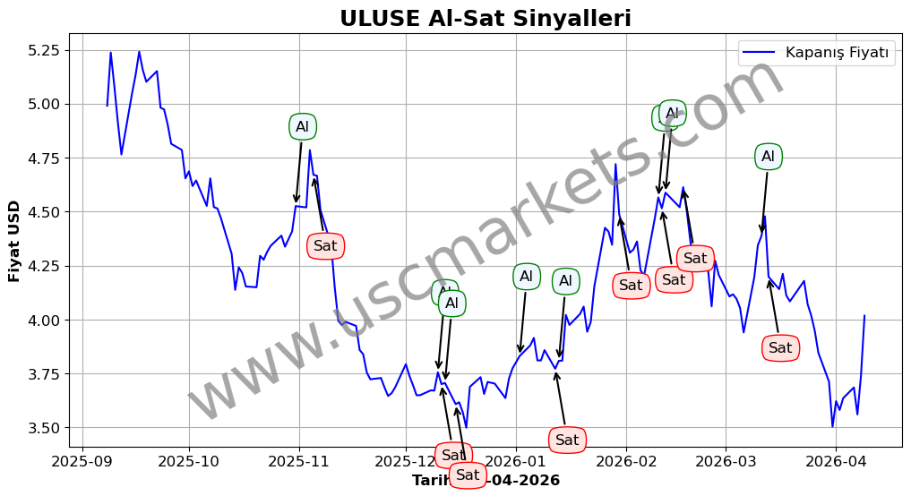 Son durum : 09-04-2026 tarihinde ULUSE hissesi için 'Alış' sinyali verildi. Bu, hissenin değer kazanma olasılığını gösterir.