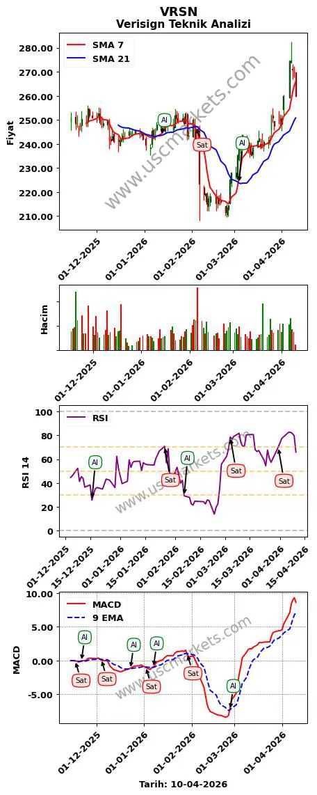 - VRSN teknik analizi MACD göstergesi (9, 12, 26 parametreleri ile) en son bir 'Al' sinyali üretmiştir.