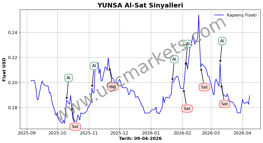 Son durum : 08-04-2026 tarihinde YUNSA hissesi için 'Alış' sinyali verildi. Bu, hissenin değer kazanma olasılığını gösterir.
