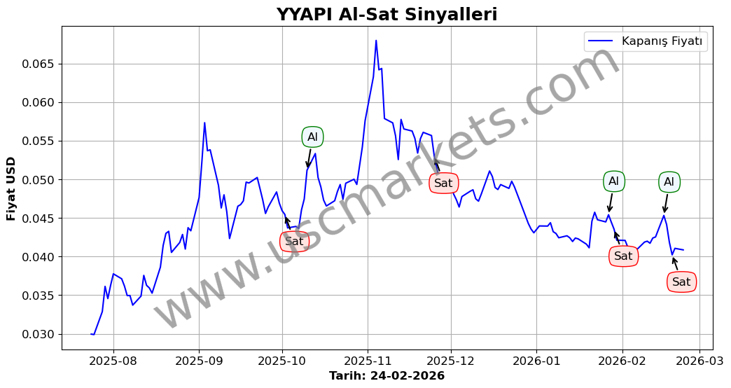 Son durum : 18-02-2026 tarihinde YYAPI hissesi için 'Satış' sinyali verildi. Bu, hissenin değer kaybetme olasılığını gösterir.