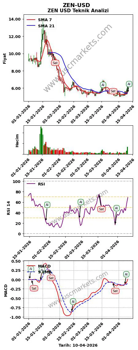 - ZEN-USD teknik analizi MACD göstergesi (9, 12, 26 parametreleri ile) en son bir 'Al' sinyali üretmiştir.