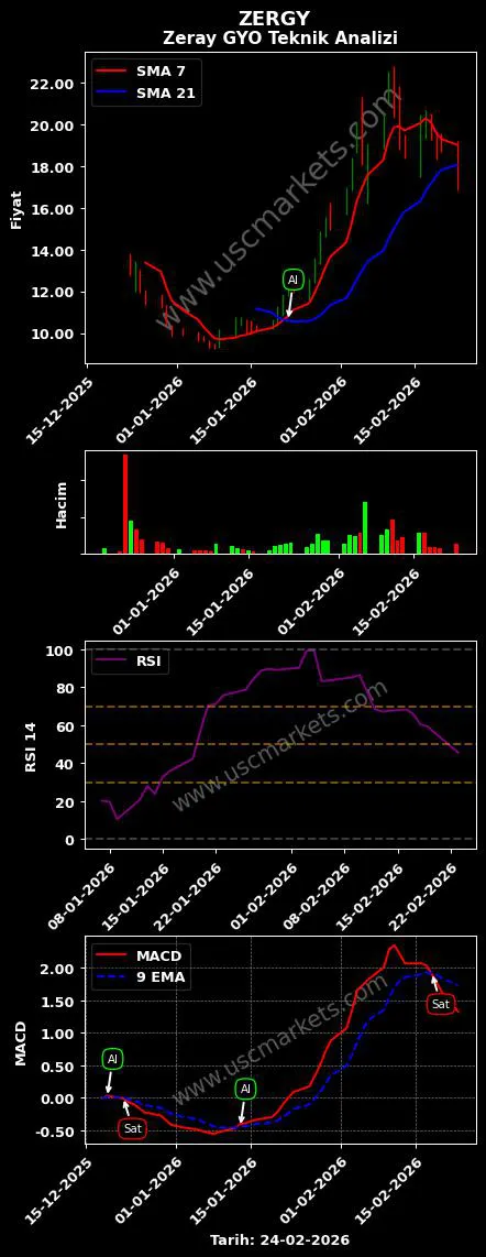 - USC Markets, ZERGY hisse senedi için MACD göstergesi (9, 12, 26 parametreleri kullanılarak) son olarak bir 'Sat' sinyali üretti. USC Markets Zeray GYO hisse senedi önerisini 'Sat' olarak belirledi.